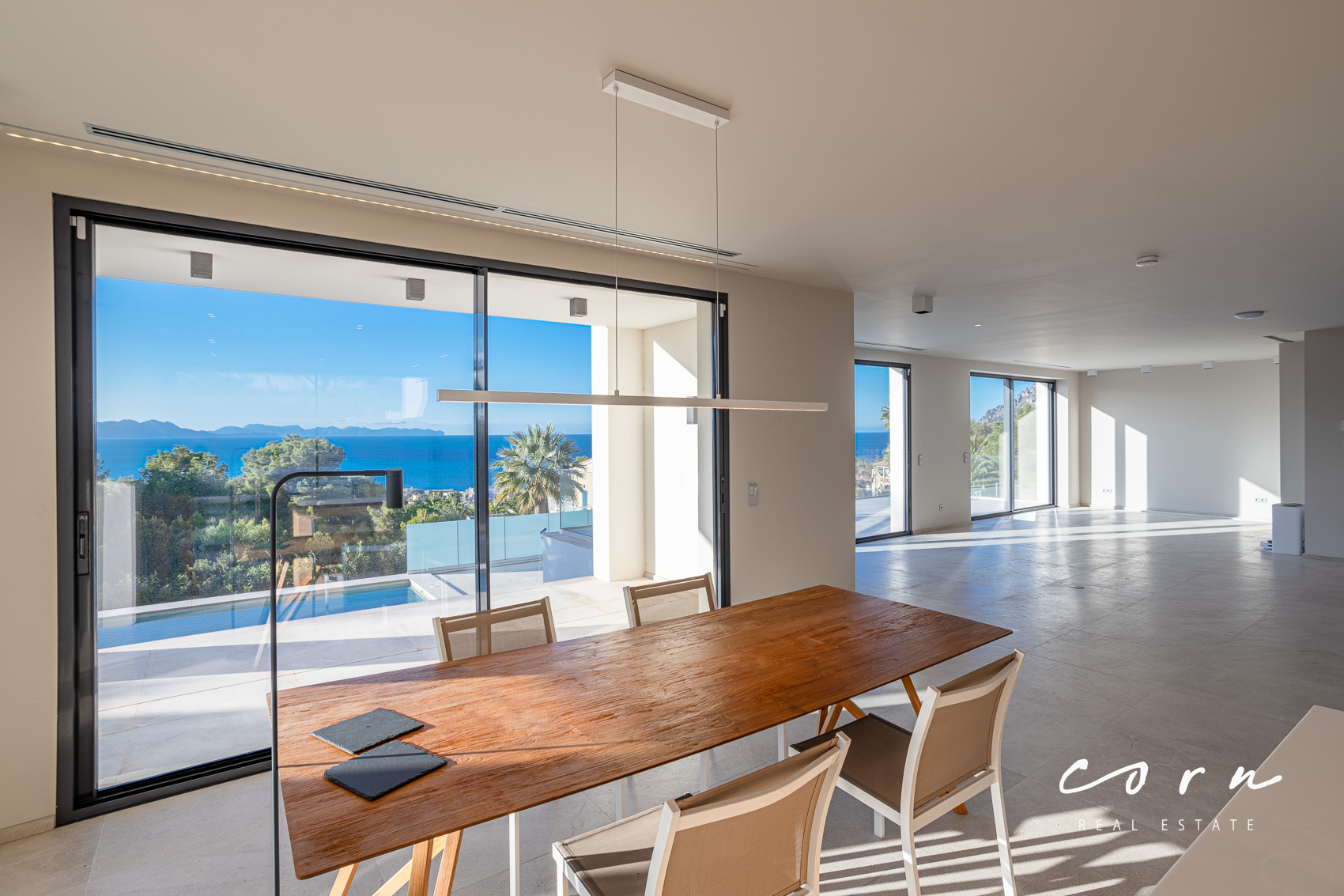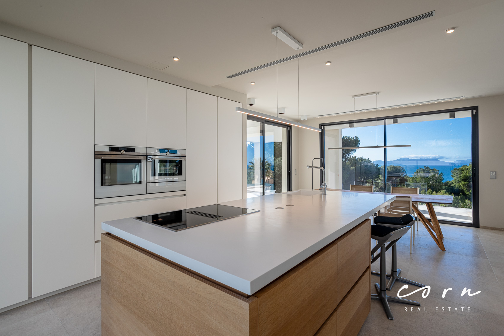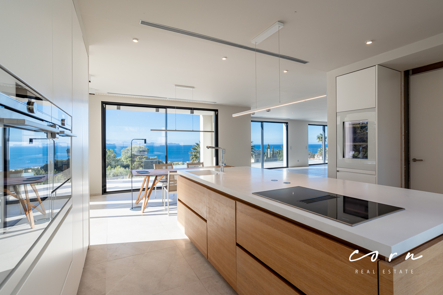 El maravilloso salón-comedor y la moderna cocina abierta ocupan una superficie de unos 90 m². Elementos de cristal correderos de suelo a techo conectan esta espaciosa zona con las terrazas circundantes, ampliando así el espacio vital y ofreciendo inmejorables vistas al mar. Aquí, la arquitectura se funde con la hermosa naturaleza de Mallorca y ofrece una experiencia de vida indescriptiblemente acogedora.