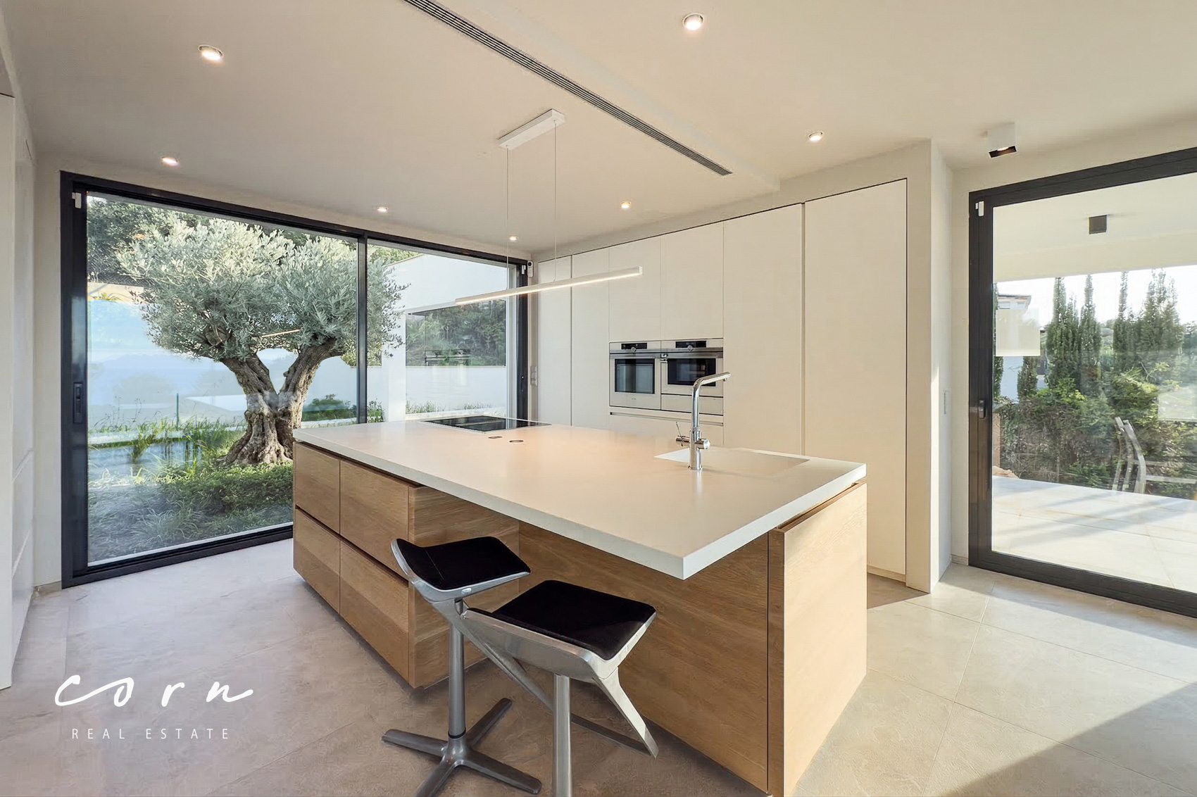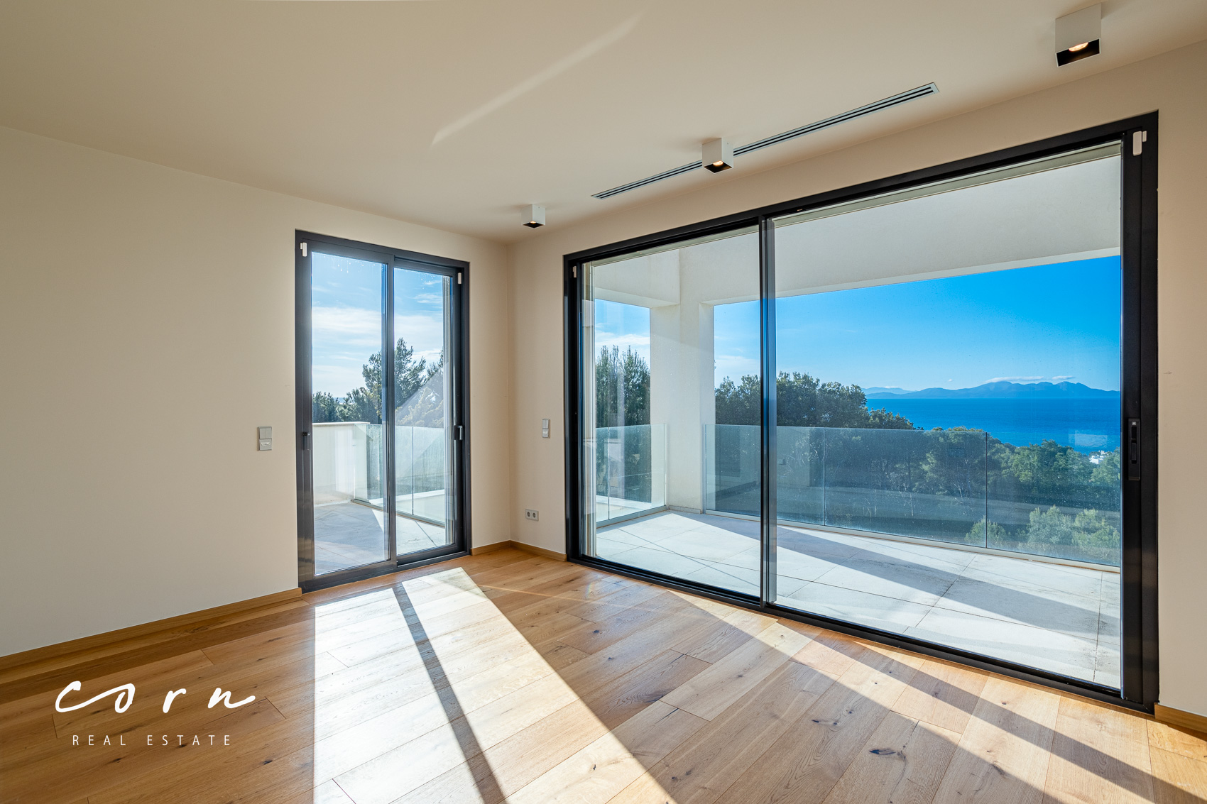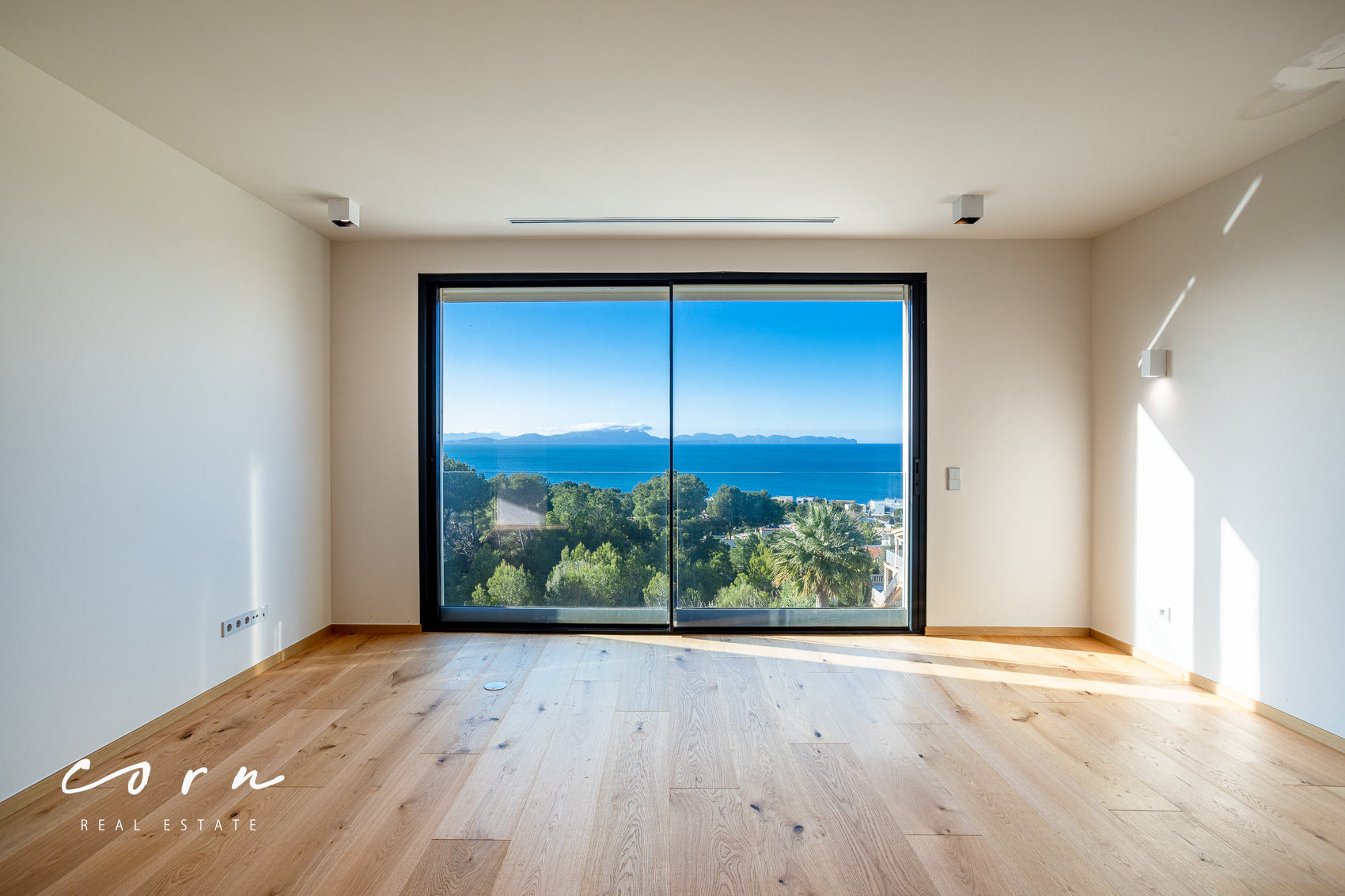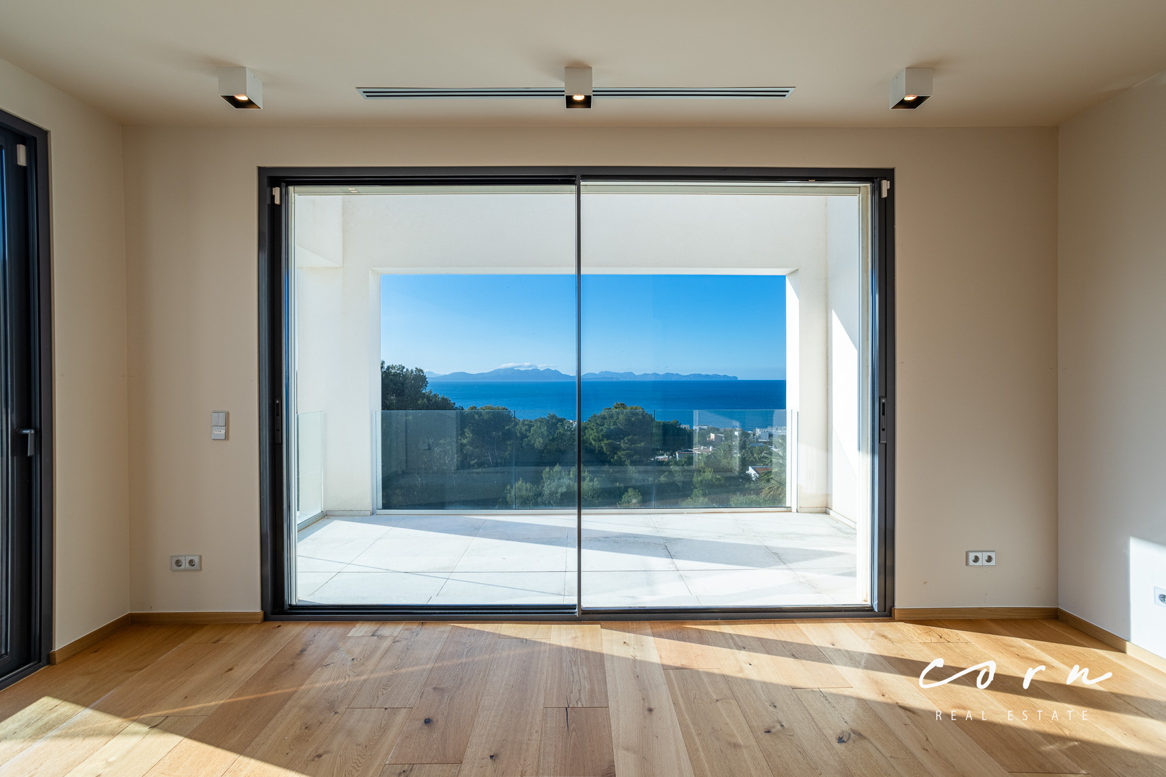 El maravilloso salón-comedor y la moderna cocina abierta ocupan una superficie de unos 90 m². Elementos de cristal correderos de suelo a techo conectan esta espaciosa zona con las terrazas circundantes, ampliando así el espacio vital y ofreciendo inmejorables vistas al mar. Aquí, la arquitectura se funde con la hermosa naturaleza de Mallorca y ofrece una experiencia de vida indescriptiblemente acogedora.