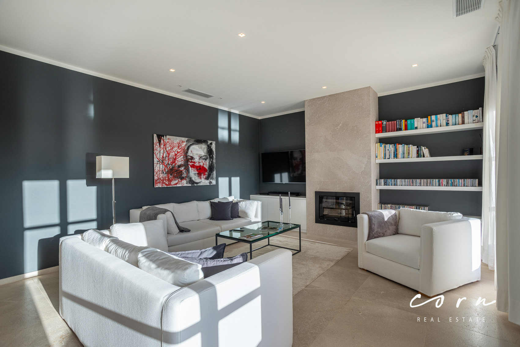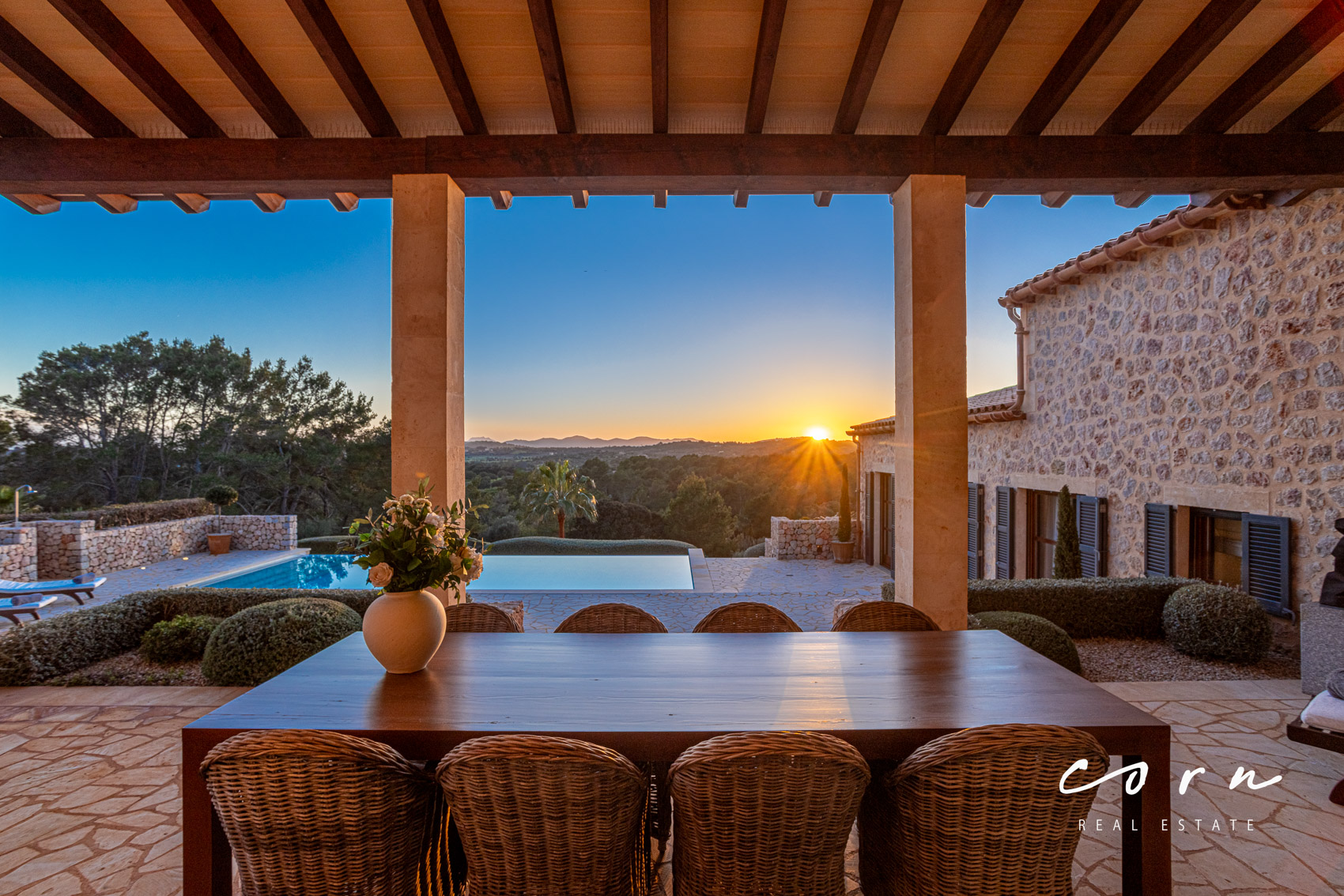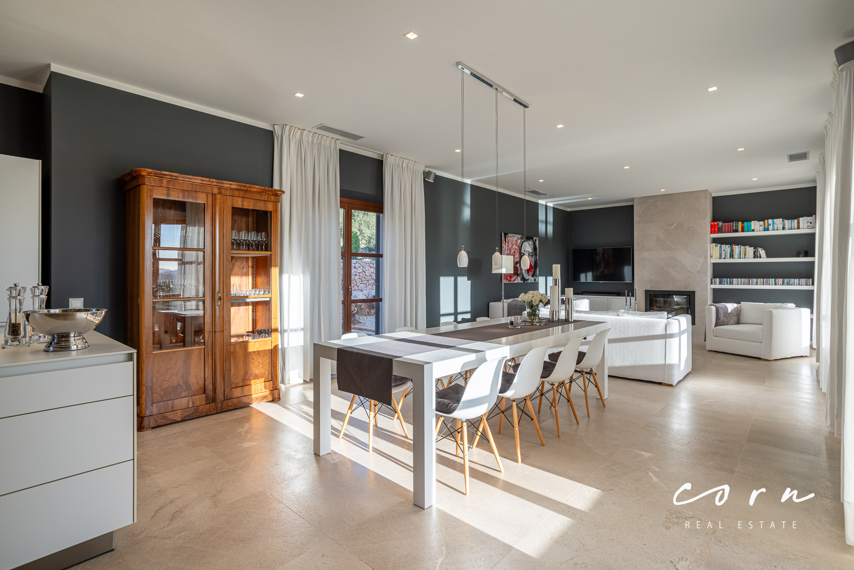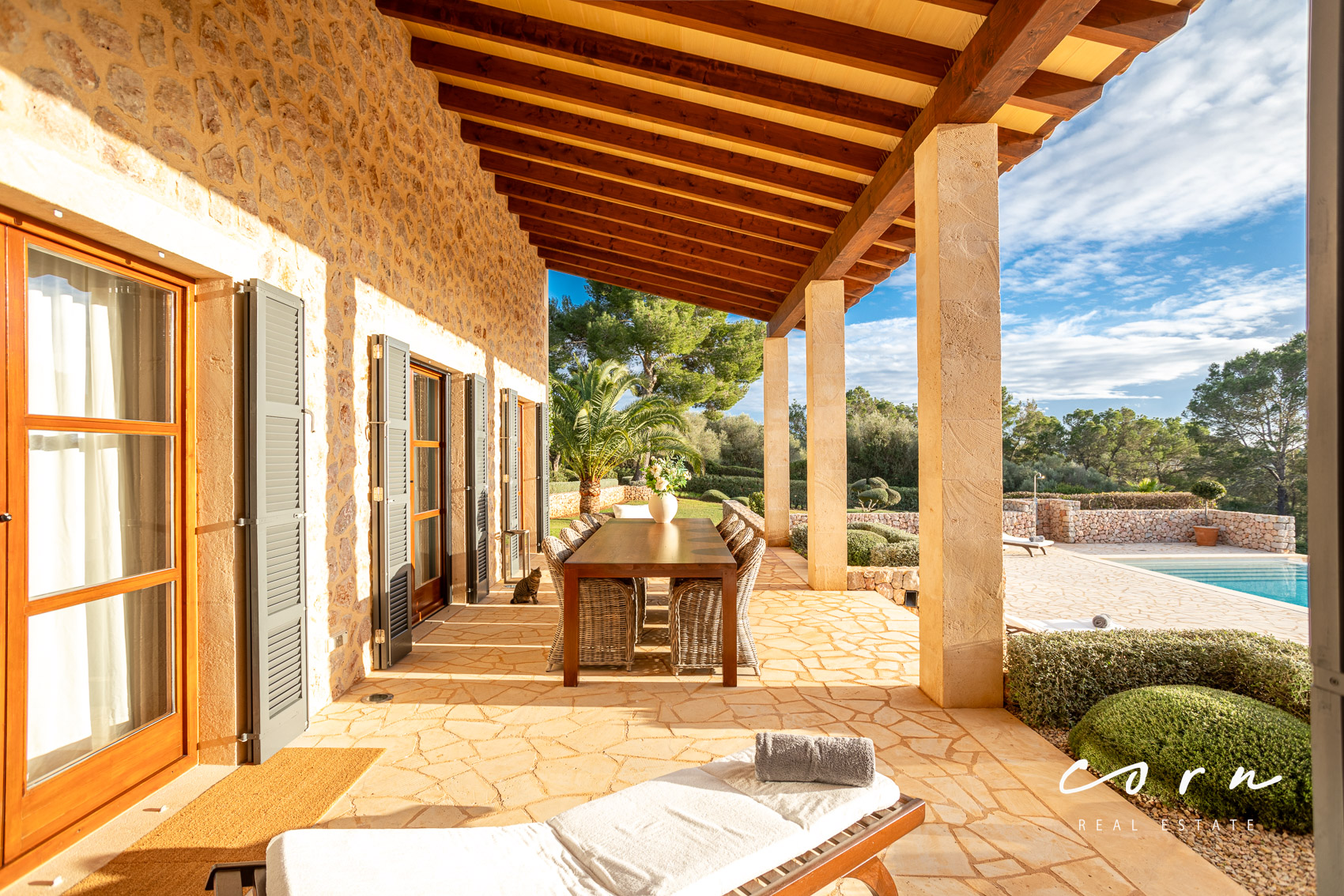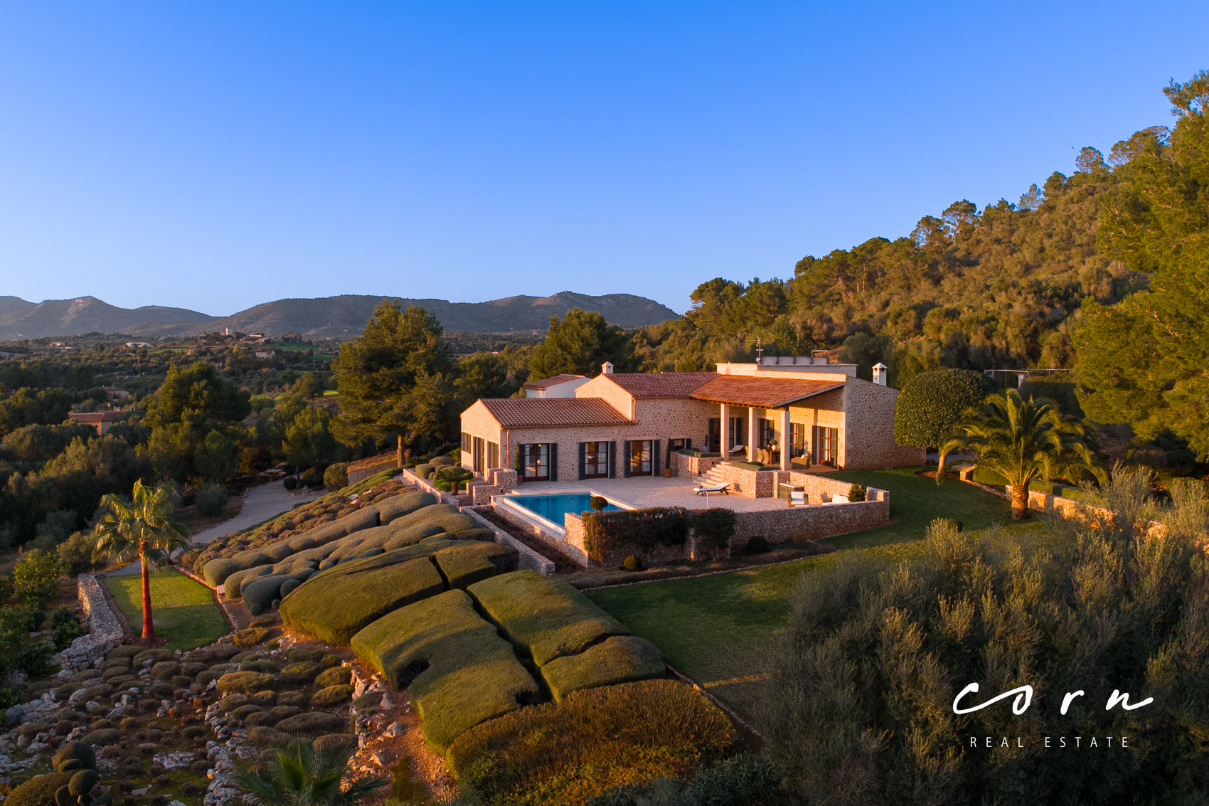 Eine traditionelle Natursteinfassade verbindet die wunderschöne Architektur harmonisch mit der mallorquinischen Landschaft. Der Lebensraum im Inneren ist bewusst modern gestaltet und mit allen zeitgemässen Annehmlichkeiten versehen: hochwertige Natursteinböden, Echtholztüren, doppelt verglaste Holzfenster, Sonos Sound System, Fußbodenheizung und eine zentral gesteuerte Klimaanlage in allen Räumen. Zusätzlich ein gemütlicher Kamin mit Umluftsystem.