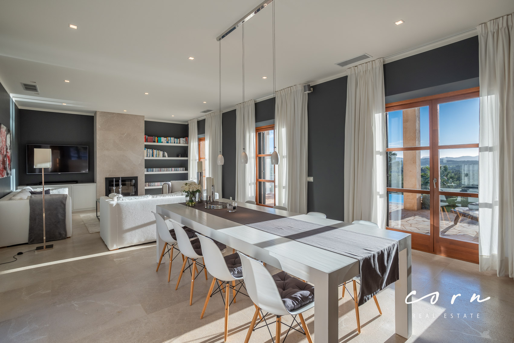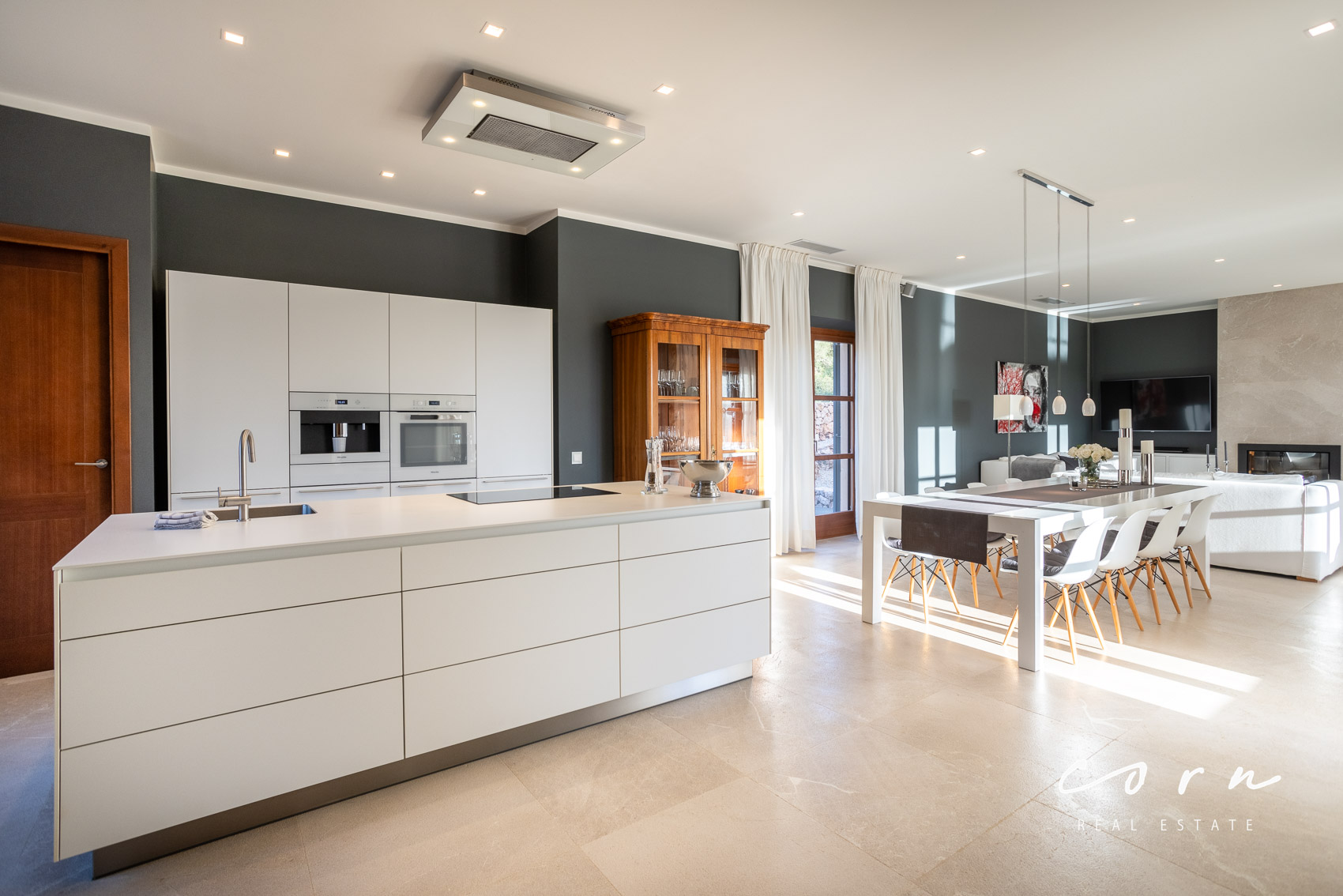Ein elegantes Entré mit Blick auf den Pool führt in den grosszügigen Wohn- Essbereich mit offenem Küchendesign. Die Designerküche von Bulthaup ist mit Markengeräten von Miele ausgestattet. Der elegante Ess- und Wohnbereich mit Kamin öffnet sich zur Terrasse mit Porche, dem Pool und bietet einen herrlichen Blick in die Weite.