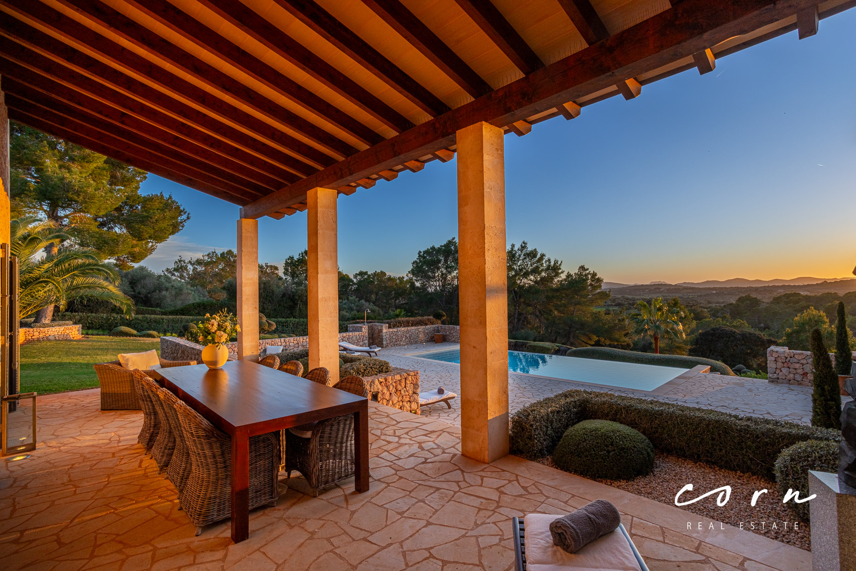 Mehrere Terrassen rund um das Haus bieten – je nach Jahreszeit – den perfekten Sonnen- oder Schattenplatz. Die professionell geplante Gartenanlage wurde mit typisch mallorquinischen Pflanzen und Bäumen angelegt und vermittelt ein Gefühl von Eleganz und Entschleunigung. Ein Olivenhain, zahlreiche Zitrusbäume und ein Gemüsegarten machen das Finca Leben auf diesem Anwesen perfekt.