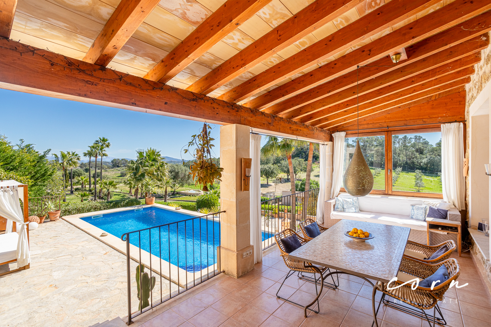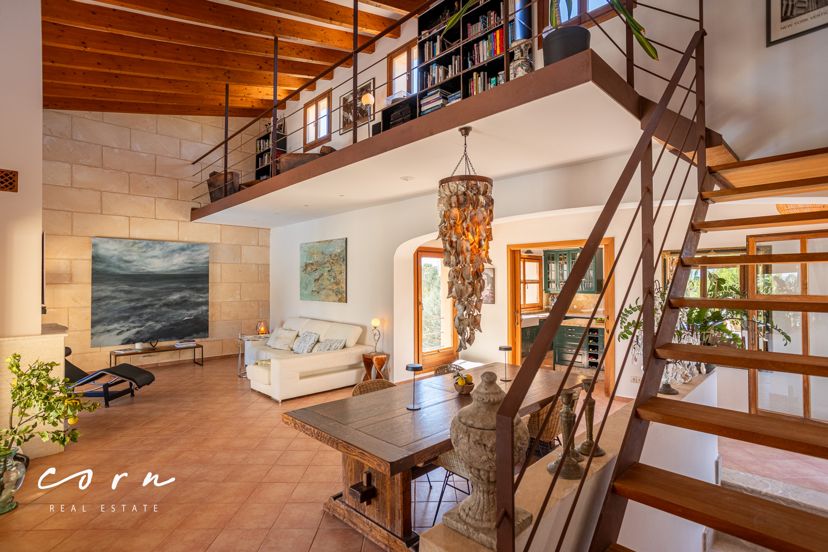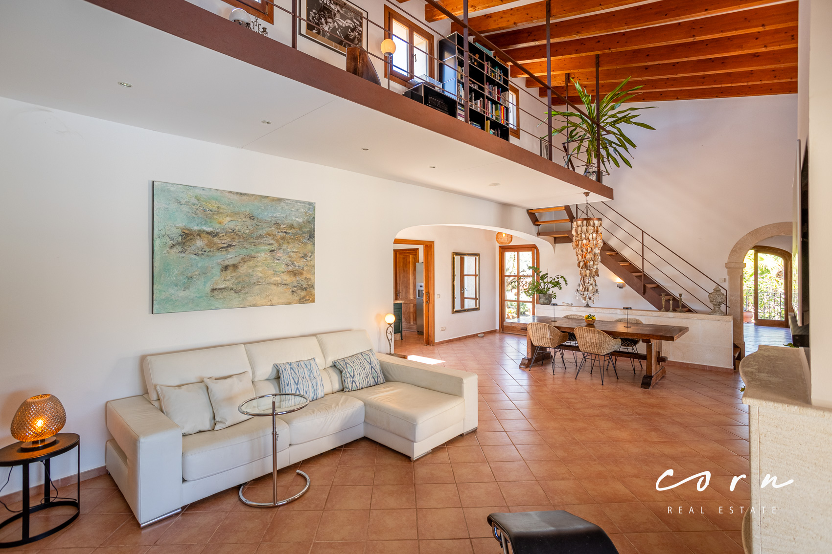 Auf einer Wohnfläche von insgesamt rund 327 m² bietet die Immobilie einen Wohn-Essbereich mit doppelter Raumhöhe und integrierter Galerie, eine voll ausgestattete Küche mit Blick auf das Grundstück, ein Master-Schlafzimmer mit Bad ensuite und ein weiteres Zimmer (das zur Zeit als Büro genutzt wird) sowie ein Gästebad. Direkt vom Wohn-Essbereich erreicht man den grosszügigen Porche, die Poolterrasse und den 42 m² grossen Salzwasser Pool. Von hier blickt man über sein Grundstück bis zum Städtchen Ariany und den dahinter liegenden Bergen des Llevant.